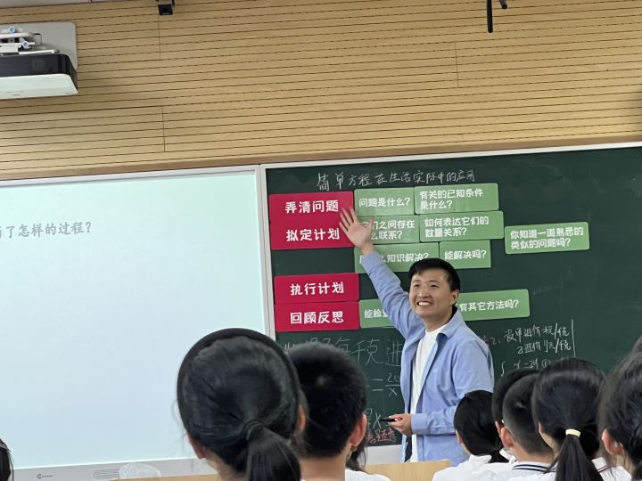 叶老师的设计从一个期末试题开始,通过老师的主导作用,在解决问题中形成解题建模方案。叶老师的板书让学生赏心悦目,体现了整堂课的设计思路与教学重难点——用方程解决问题,体现解决问题的四步骤:弄清问题,拟定计划,执行计划,回顾反思。
