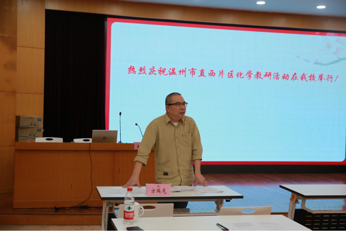 温州教育教学研究院的方瑞光老师对本次活动进行了全面而深刻的点评和提升。方瑞光老师首先对黄老师所提出的“情境-问题二轮驱动”的教学理念进行了精炼的概括,并给予了高度的评价,认为这些理念为教学创新注入了新的活力,为教学改革提供了新的思路。他鼓励我们的课堂教学要促进学生学会思考,要提升学生化学学习力。紧接着,方老师对前面两位授课老师的精彩课堂表现给予了高度赞扬,肯定了她们在课堂上的教学艺术与专业素养。对于两位老师在课堂上的不足之处,方老师也提出了中肯的改进建议。