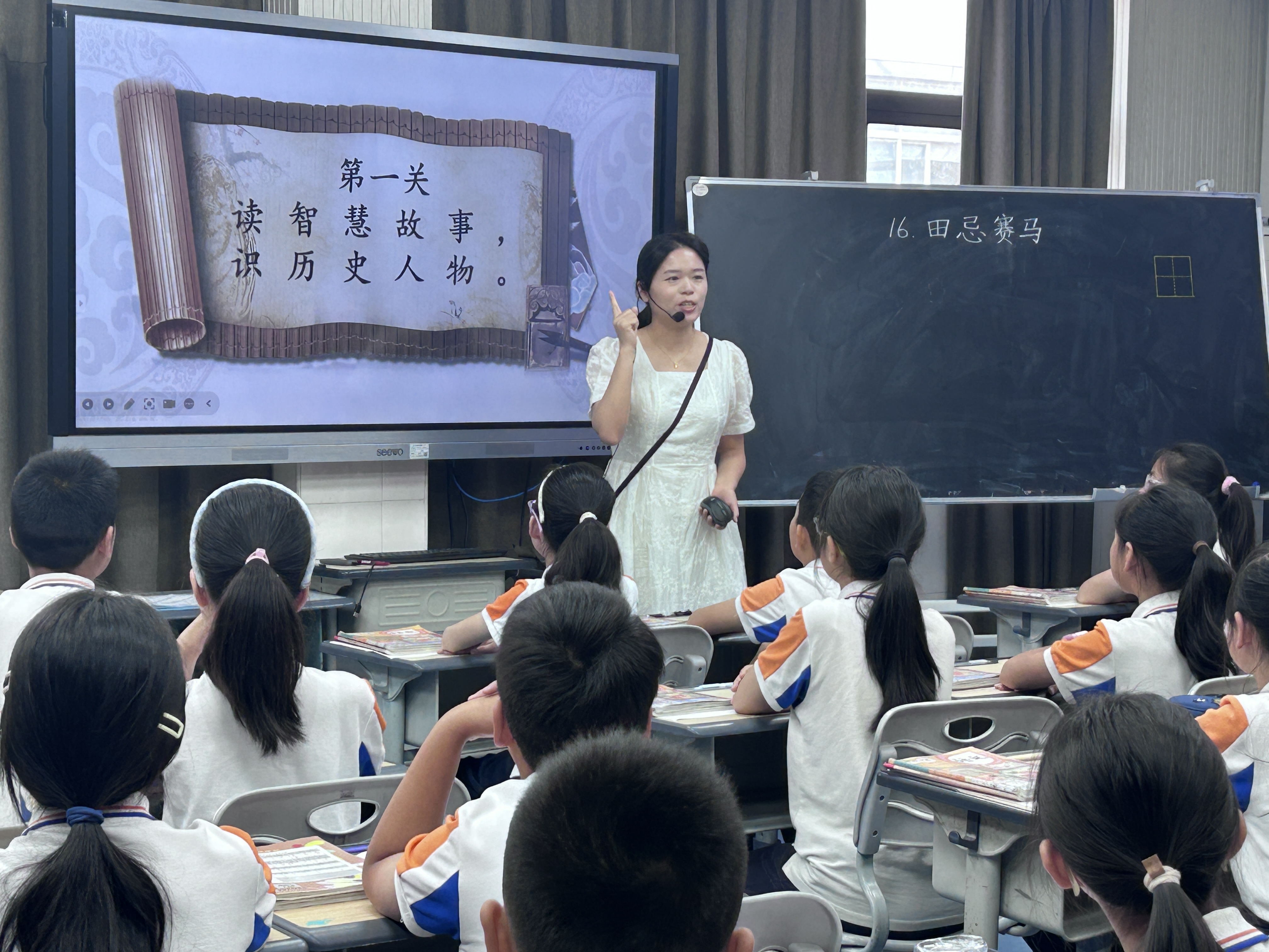 第一节课由宋彬巧老师和五(1)班的学生带来课例《田忌赛马》。宋老师通过创设阅读竞赛情境,引导学生深入分析孙膑的思维过程,借助图示和角色扮演,让学生理解变通思维的重要性。课堂生动展现了如何将历史智慧与现代教学相结合,带着学生从文字中体会历史人物的思维智慧,培养学生的深度思维能力。