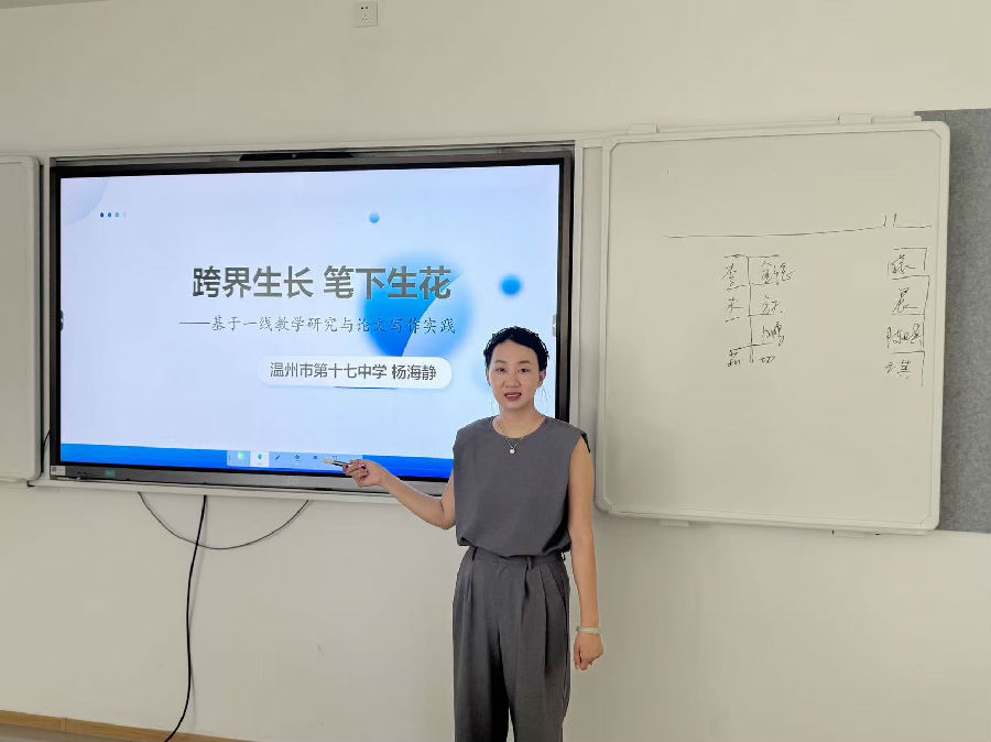 讲座结束后,经验交流环节接续开展。温州市第十七中学杨海静老师以 “跨界生长 笔下生花” 为主题,分享了一线教学研究与论文写作的实践心得。她结合日常教学中的真实困惑,讲述了如何从课堂细节中挖掘论文选题,如何通过跨学科视角丰富研究维度,为学员提供了 “从实践到文字” 的实用技巧。