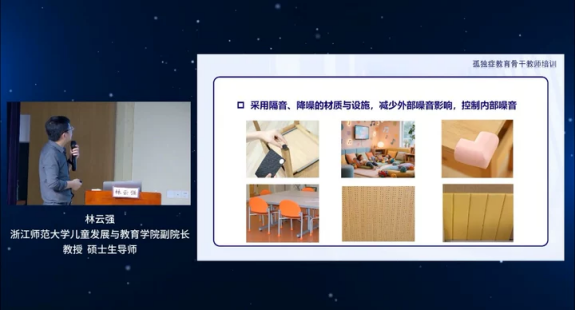本次活动特邀浙江师范大学儿童发展与教育学院副院长林云强教授,带来《基于孤独症儿童的多样支持--视觉支持的设计》专题讲座。讲座围绕孤独症学生在不同环境下的表现差异展开,深入剖析其感官特点。其中65%的孤独症学生对噪音敏感,高分贝或复杂背景音易引发情绪波动;视觉层面则偏好蓝、绿等冷色系,高饱和度色彩、强光易造成不适;而触觉、嗅觉方面的反应则存在明细个体差异,部分学生对特定触感、气味有独特反应。