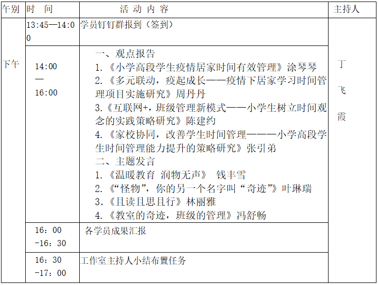 省“疫情与教育”专项课题《四维四策:小学高段学生居家学习时间管理习惯养成实践研究》课题组全体成员、王杨名班主任省市区工作室全体学员。请做好参加活动的相关工作。请各学员于2020年7月16日(周四)下午13:45之前在在钉钉群报到,活动14:00准时开始。